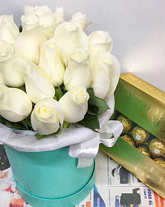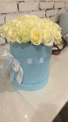 Белые цветы издавна обозначают доброе отношение, светлые чувства, нежность, чистоту и гармонию. А розы этого цвета – лучшие цветы, подходящие ребенку в честь Дня Рождения, возлюбленной на свидание или годовщину и невесте на свадьбу. Цветочная композиция в стильной голубой коробке смотрится органично, а добавление зелени обеспечивает естественность и натуральность. Запах роз улучшает настроение дарит позитив, оставляя навсегда отпечаток в памяти.